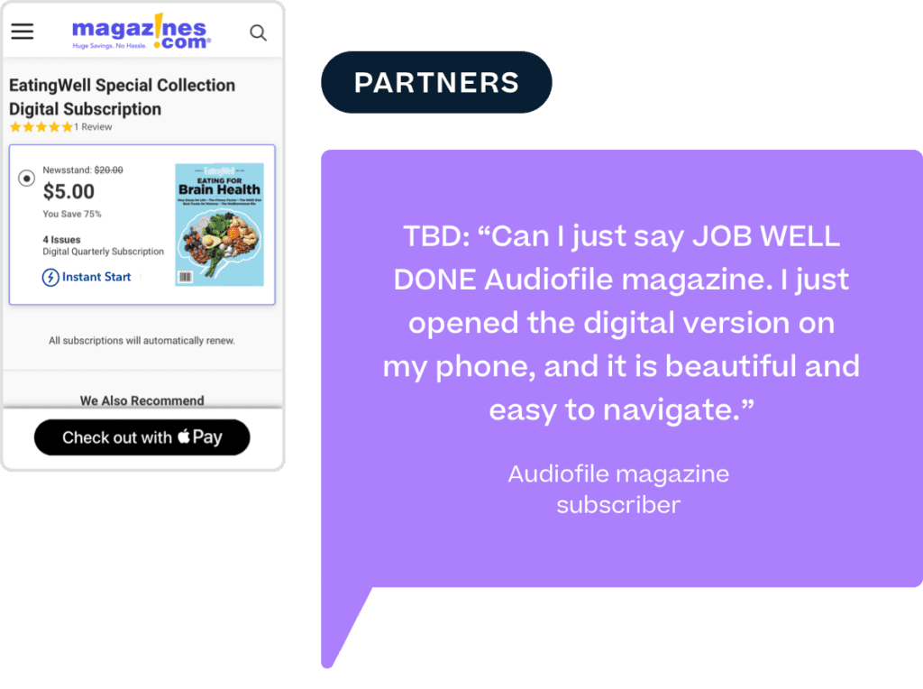 Produce a best-in-class mobile version of your magazine, deliver them to subscribers, publish content to Apple News+, set up landing pages to sell digital and print, and more. Everything we offer is turn-key and requires no coding from your team.